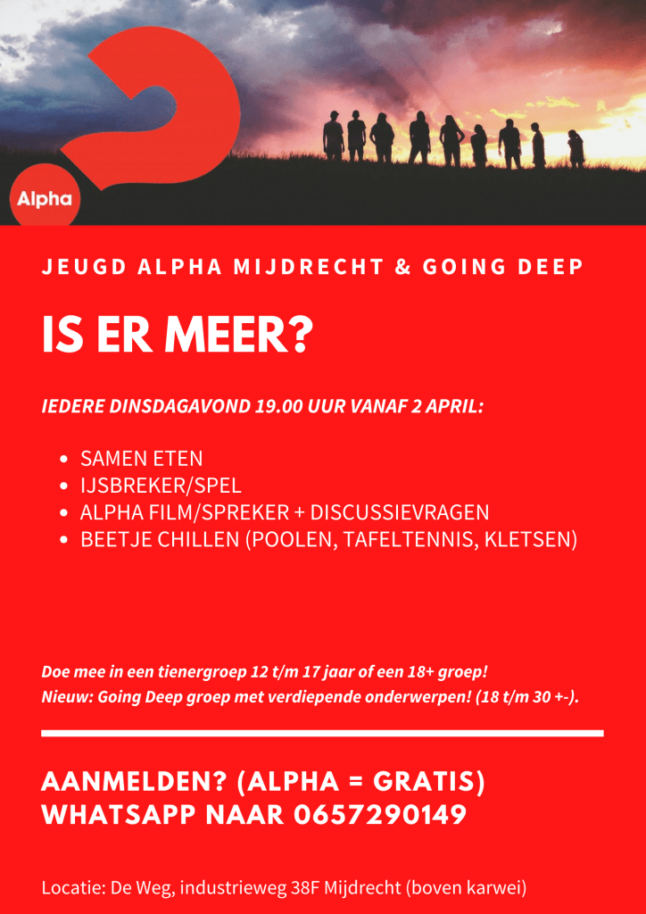 Alpha en Going Deep vindt plaats op de locatie van De Weg, industrieweg 38F Mijdrecht (boven karwei). Gezamenlijk opgeven kan en neem vooral vrienden en vriendinnen mee! De Alpha en Going Deep is geheel gratis! Check de flyer voor alle data! Laat even weten of je komt door te Whatsappen naar 0657290149, zodat we weten voor hoeveel jongeren we eten nodig hebben. Na de Alpha willen we nog wat toffe activiteiten gaan doen, zoals met elkaar varen en zwemmen op de Vinkeveense Plassen en een BBQ. Hopelijk zien we je de eerste Alpha en Going Deep avond op dinsdag 2 april om 19.00 uur!
